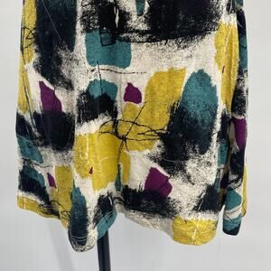 Keywords: artistic wearable art to wear funky unique colorful vibrant bold retro pinup pin up rockabilly painterly painted brush strokes brushstroke hipster grunge casual dress stretchy knit jersey knit knitted stretch knit scoopneck short sleeves beige ivory off white mustard yellow gold teal blue green black maroon purple burgundy a line aline blousy