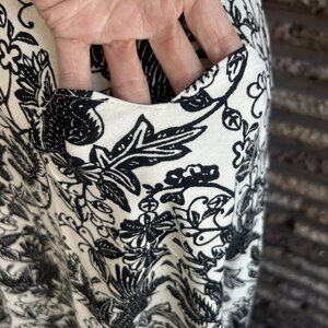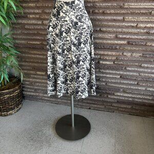 Chic A-line skirt with intricate black floral design on white. Ideal for versatile styling.