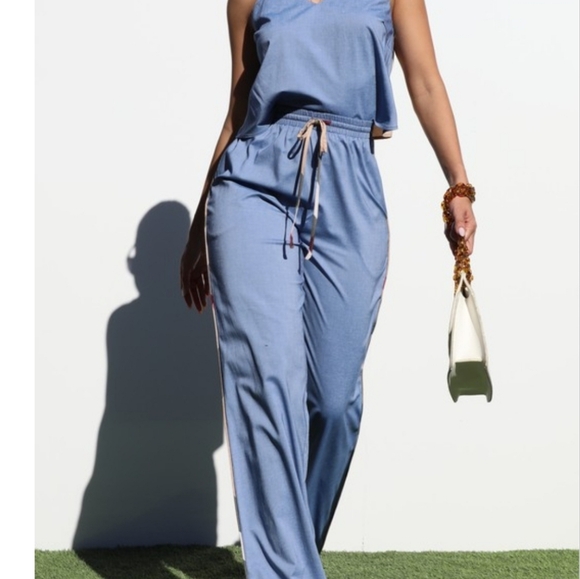 The pants are designed with a relaxed, wide-leg fit and an adjustable drawstring waistband for a flattering, customizable fit. What sets this piece apart is the signature side stripe detail, crafted from the same patterned material as the back of the top—creating a cohesive, fashion-forward finish that ties the entire look together.
