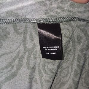 Black with purple and green print. 95% polyester 5% spandex size medium