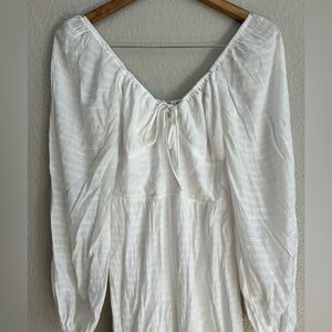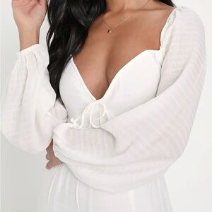 Lulus Effortlessly Adored White Balloon Sleeve Wide-Leg Jumpsuit! Lightweight woven fabric, with a subtle striped pattern throughout, shapes this romantic jumpsuit. Balloon sleeves (with elastic at the cuffs and shoulders) frame a bustier-inspired bodice with a sultry sweetheart neckline and a tie detail. Wide legs finish at ankle-grazing hems. Hidden zipper/clasp at back.