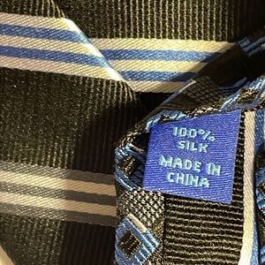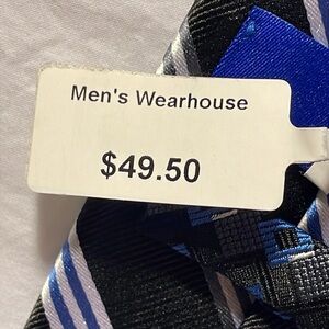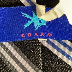 Egara 100% silk black tie with white, blue and silver stripes. New with tags.