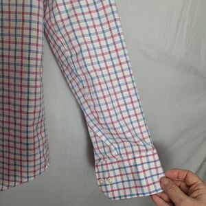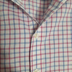 This casual button down shirt features a stylish checkered pattern in blue and red on white. Made from lightweight cotton and spandex, it offers a comfortable fit with a pointed collar and buttoned cuffs, making it perfect for relaxed outings. Casual office, Business, Outings, Meetings, Norm