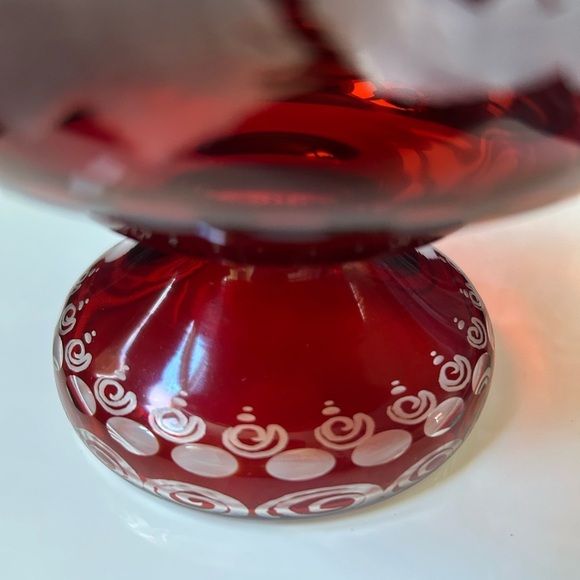 This bowl features a clear cut to ruby red glass with etched, satin, and clear designs, including swirls and ovals.