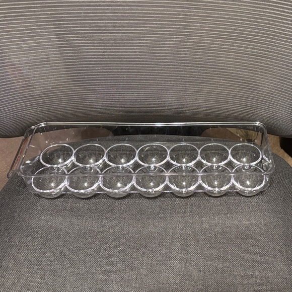 Transparent egg storage container with a sleek design. Holds multiple eggs securely.
