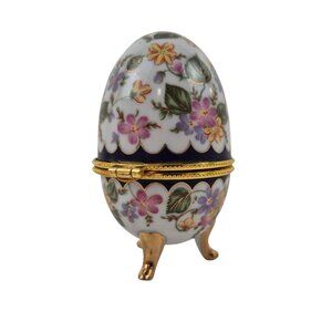 Egg Trinket Box Vintage Floral Porcelain Gold Accents Hinged Lid Tripod Legs