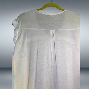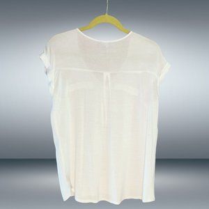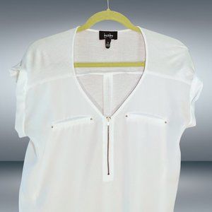 EggShell Rolled Short Sleeve Zip V-Neck Blouse - Opaque Silky Front, Knit Back