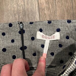 Eggie polka dot puffy sleeve mini dress. Wool blend dress with unique style and flair. Stand out from the rest! So flattering with bare shoulders and puffy sleeves! Off the shoulder sleeves and twist front detail. Navy polka dot and tweed like texture.