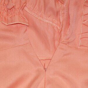 The Eggie Peach Sleeveless Tie Front Ruffled Straps A Line Mini Dress in size XS is a cute and stylish option for various occasions. The dress features a V-neckline, ruffled straps, and a zip closure, making it perfect for parties, cocktails, or casual wear. With a solid pink color and a short length, this dress has a fit & flare style that is ideal for teens looking for a trendy and comfortable outfit. Made of a blend of polyester, rayon, and cotton, this dress is machine washable and easy to care for. Perfect for summer, fall, or spring, this dress embodies a fairy-like and whimsical aesthetic.