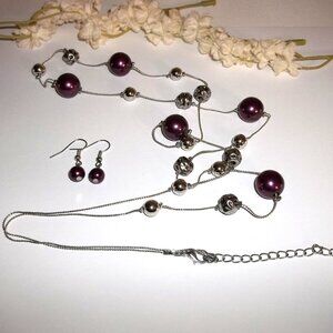 This charming pre-owned necklace and earring set is considered costume jewelry. It features silver-toned chains with dark eggplant purple faux pearl beads and silver metal beads.