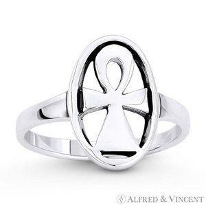 Egyptian Ankh Cross Key-of-Life Oval Charm Ring in .925 Sterling Silver - Size 5