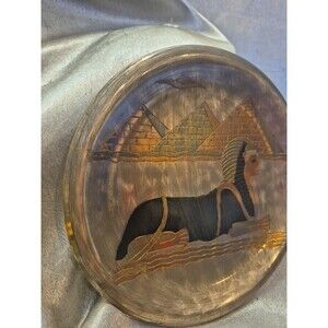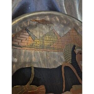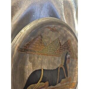 This beautiful Egyptian brass wall decor plate is a stunning piece of art that will add a touch of ancient civilization to your home. The plate is brass, silver plated, copper tones and is hand etched with intricate designs of the Great Pyramid and Sphinx, making it a unique and rare item that will be a great addition to any collection. Measuring 8 inches diameter, it is the perfect size for any wall and will surely catch the eye of anyone who sees it. Don't miss out on this unique opportunity to own a piece of Egyptian culture.