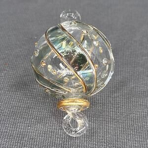 Set of 2 delicate hand-blown glass ornaments, clear with iridescent aqua green & purple each hand-decorated with gold spiral striping and raised dot details, loop tops for hanging, and matching glass finial bottoms. Includes original Egyptian Museum Store Cairo gift boxes.