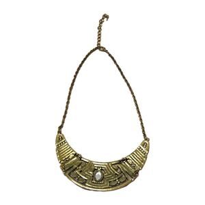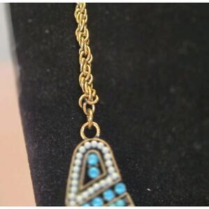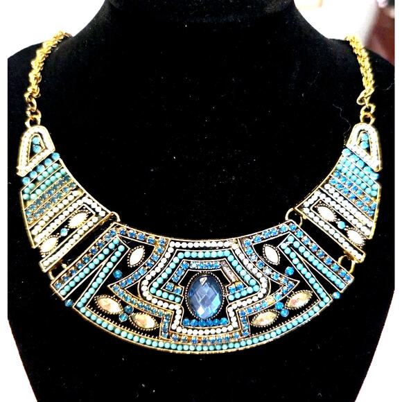 Egyptian Pharoah Bib Necklace Blue Stones Beads Gold Tone Rope Chain Statement