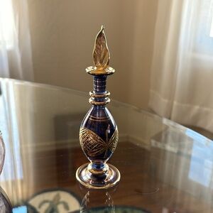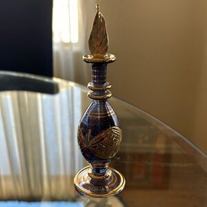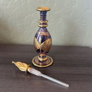 Egyptian Purple and Gold Glass Perfume Bottle with Stopper.  Excellent condition, no chips or cracks.  Never been filled.  Stopper has a glass application wand.  Measures 7”x2”.