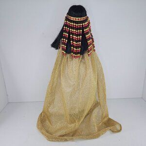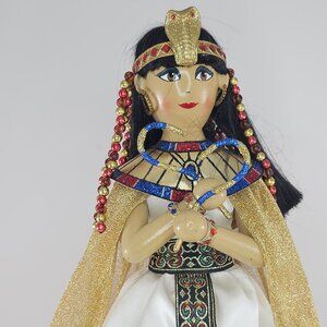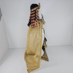 Decorative nutcracker portraying an Egyptian queen with intricate details. Features a golden cape, staff, and black cat. Ideal for themed decor.
