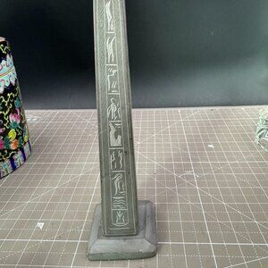 This obelisk figurine adds a touch of ancient Egyptian elegance to any space. Crafted from stone, it features intricate hieroglyphs and stands 9 1/2 inches tall, making it a distinguished decorative piece.