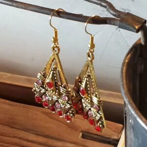 Egyptian Style Red Pink Austrian Crystal Art Deco Carved Gold Triangle Earrings