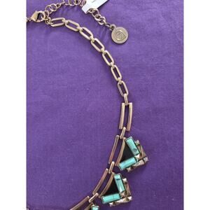 This Egyptian Style Statement Necklace by 7 Charming Sisters features a striking design with antiqued gold-tone brass Chevron link stations adorned with simulated turquoise stones. The necklace has a Lobster closure and is signed by the brand. The bold bib style and ethnic theme make it a standout piece perfect for adding a touch of beauty and bohemian flair to any outfit. With a 21-inch length and adjustable features, this unique necklace is a must-have for those who appreciate statement jewelry. This item is new in the original package.