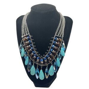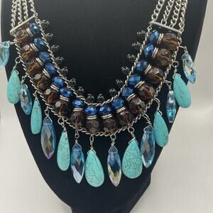 Egyptian Revival Style Statement Necklace Silver Tone Chain Blue Turquoise Teardrops