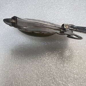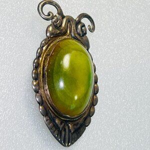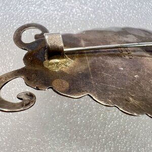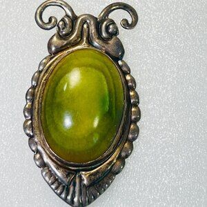 This intricately designed brooch exudes Antique charm with its Mexican silver craftsmanship and captivating green stone centerpiece. Its timeless elegance is enhanced by ornate detailing, making it a distinguished accessory. The piece is versatile, blending effortlessly with various outfits while showcasing artisanal heritage, reflecting the rich culture and artistry of its origin.