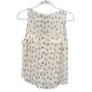 Eiffel Tower Print Sheer Tank w/ Pockets Buttons Eiffel Towers in red and black on an off white/cream base Sleeveless Double pockets, buttons down the front Sheer material, need an undershirt, or a cute bra. Pair with a red jacket and a black jean Perfect summer top! Size small Approximate lay flat measurements in inches: Length 24" Pit to pit 18" Pet free smoke free home Offers welcome