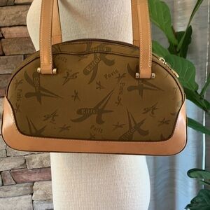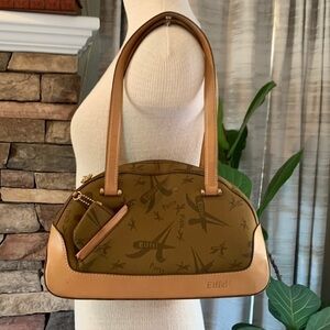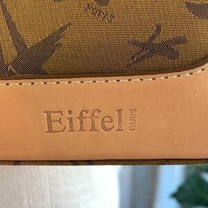 Eiffel brand shoulder bag leather and material purse. Leather handles and on bottom. Leather has a few marks but overall condition of purse is great. Eiffel logo on front. Purse measures 12x8. One inside zipper compartment and one outside compartment with small attached pouch for keys etc.