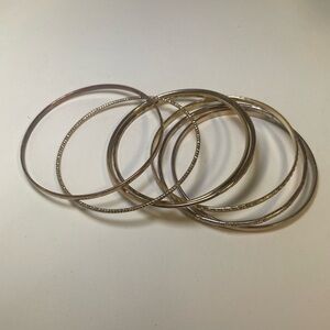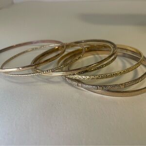 Enhance your style with this elegant bangle bracelet set featuring a blend of textures and widths in gold tones. 8 bangle bracelets. Perfect for stacking. Good preowned condition.
