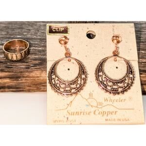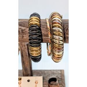 Lot of Tri-Tone Metal/Copper Jewelry Pieces -- Five Bracelets, two rings, and a pair of NWT clip on earrings. Pre-owned, these jewelry pieces are in various conditions and being sold as is. All wearable.