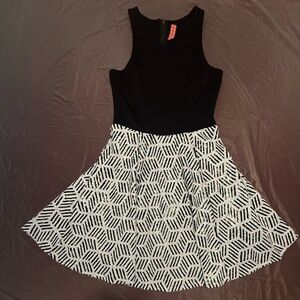 This chic dress by Eight Sixty features a sleeveless halter neckline and a fit and flare silhouette, perfect for casual or work settings. The black bodice contrasts beautifully with the black and white geometric patterned skirt, creating a striking visual effect. The midi length and flared design offer both style and comfort, making it a versatile addition to any wardrobe.