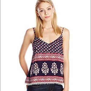 Flirty and fun top with beautiful hem. V-neck in front and in back. Adjustable straps. Fun pattern for summer! Navy & Red. 100% Rayon. Perfect condition!