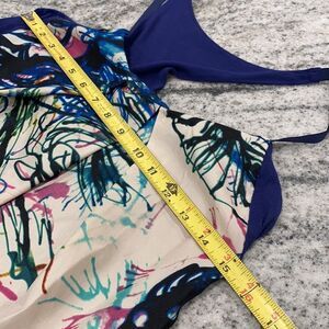 Silky front top with artistic abstract design. Back is a softer cotton feel with some wear from regular use. Loved wearing this to craft fairs and events, always received compliments on it! So cute on its own but can be elevated under a black blazer or kept casual with a denim jacket.