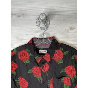 Item: Mens short sleeve button-up shirt with allover red rose floral print on black