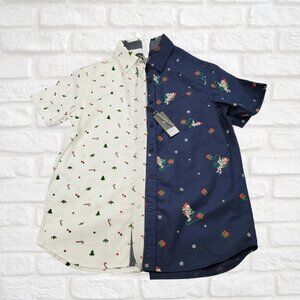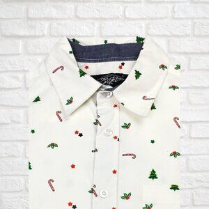 First shirt is white with candy canes, trees, holly and stars in red and green