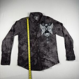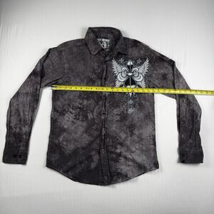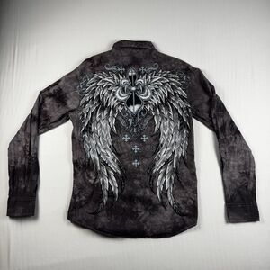 The Eighty Eight Affliction Y2K Vintage Grunge Angel Wings LS Gray Shirt is a stylish men's casual button-down shirt with a unique angel-themed design. Made from comfortable cotton material, this long-sleeve shirt features a collared neckline and button closure. With a regular fit and size M, it is perfect for casual occasions in the winter, fall, or spring seasons. The gray color and grunge theme add a edgy and vintage touch to the overall look, making it a fashionable choice for any man's wardrobe.