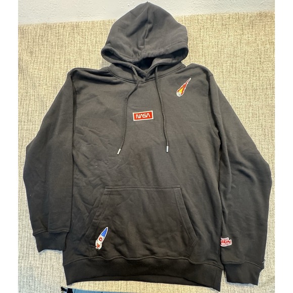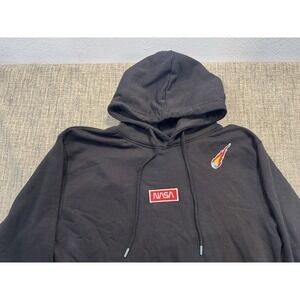 The Eighty Eight Brand Hoodie in size Large features a unique NASA patch work design in black with outer space and astronaut accents. This pullover hoodie has a drawstring closure, hooded neckline, and long sleeves, making it perfect for the winter, fall, and spring seasons. Made from a blend of polyester and cotton knit fabric, this hoodie is machine washable and has a regular fit. The space theme and astronaut character add a cool and stylish touch to this activewear piece, ideal for gym training, walking, or hiking.