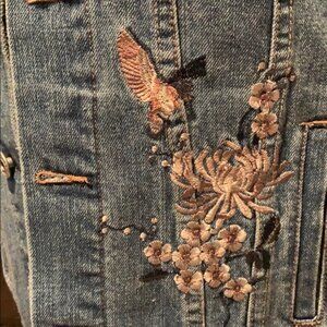 This is a fun long in length jean jacket. The embroidered details are beautiful.