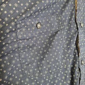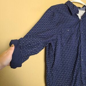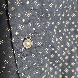 This is a navy colored button up shirt by Eighty Eight. It has white embroidered details, a full button panel, and buttons on the cuffs.