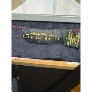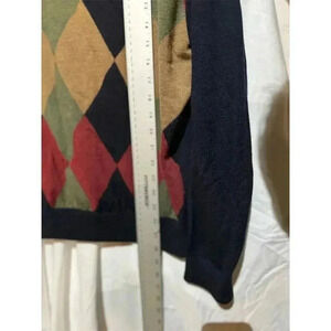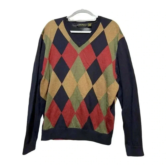 The Eildon Hills pullover sweater for men is a multicolor, regular-sized garment crafted from 100% extrafine merino wool. It features a V-neck and a tight-knit argyle pattern, offering a luxurious feel and exceptional warmth. Designed for casual fall occasions, this long-sleeve sweater is made in China and requires dry cleaning. The sweater is pre-owned. Keywords: Eildon Hills, men's sweater, pullover, merino wool, V-neck, argyle, geometric, casual wear, fall fashion, knitwear, multicolor, long sleeve, pre-owned.