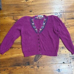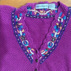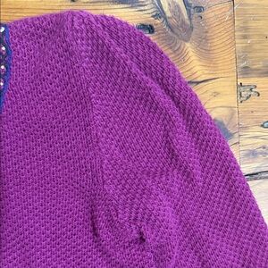 Elevate your wardrobe with this elegant women's cardigan featuring intricate embroidery. The rich purple hue adds a touch of sophistication to any outfit. Beautiful purple sweater for the winter! Such intricate detail! Preowned!