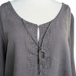 Eileen Fisher 100% Irish Linen Beaded Lagenlook Pullover Neck Tie Top Gray Large