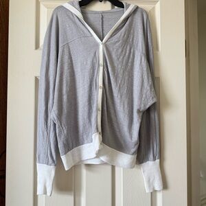 Eileen Fisher 100% linen cardigan with hoodie,buttons up oversized, lightweight, ribbed cuff and hem, versatile piece, casual, beach coastal, vacation. Great preowned condition, gently used,no flaws ( last button is different )