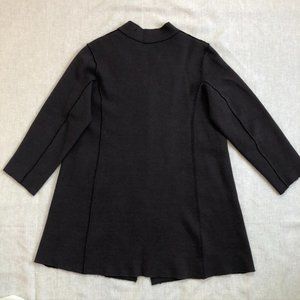Cozy and warm! 100% Merino is super soft. Wear it open, or buttoned, looks great either was. There is a little hole on the back of the collar, and one on the back, by the bottom, otherwise in great shape!