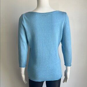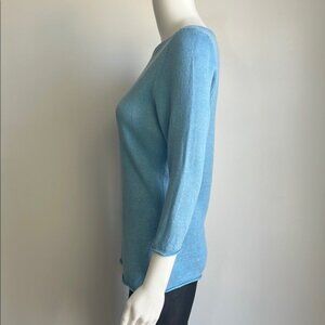 This Eileen Fisher sweater in a calming blue hue features a ballet neck design, offering a relaxed and comfortable fit.