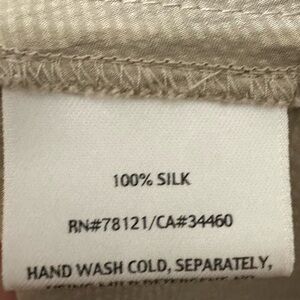 100% silk button front blouse. Long sleeves. Metallic goldish beige color. Dan be worn casually or dressed up.