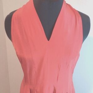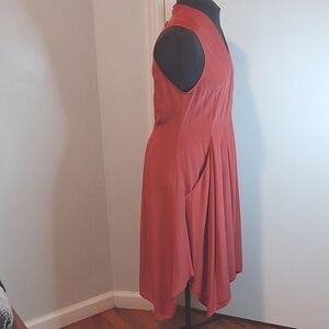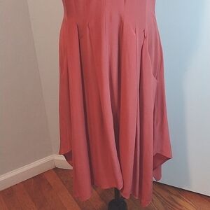 Beautiful 100% silk dress with Gored bodice, full skirt, inset pockets, handkerchief front hem, side zipper.