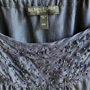 Eileen Fisher 100% Silk Navy Blue Sequin Dress Size M Petite Strappy Knee Length