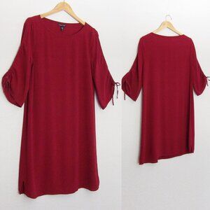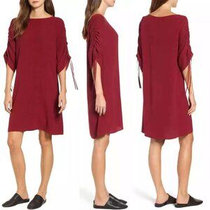 Eileen Fisher 100% Silk Ruched Sleeve Shift Dress In Dark Tulip S Burgundy $378