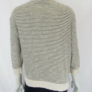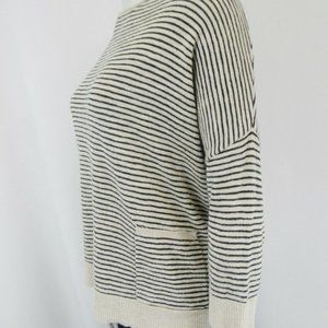Eileen Fisher knit box-top. Striped pattern. Organic linen and cotton. Ballet neckline. Dropped shoulders. A classic shape. 3/4 sleeves. Stretchy. One pocket.