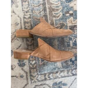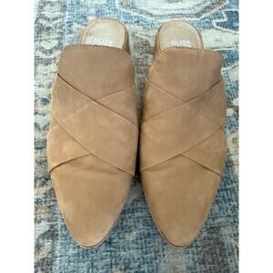 Nubuck tan mule with cross cross flat leather design. Low 1” stacked block heel. Padded toes and arch, pointed toe.